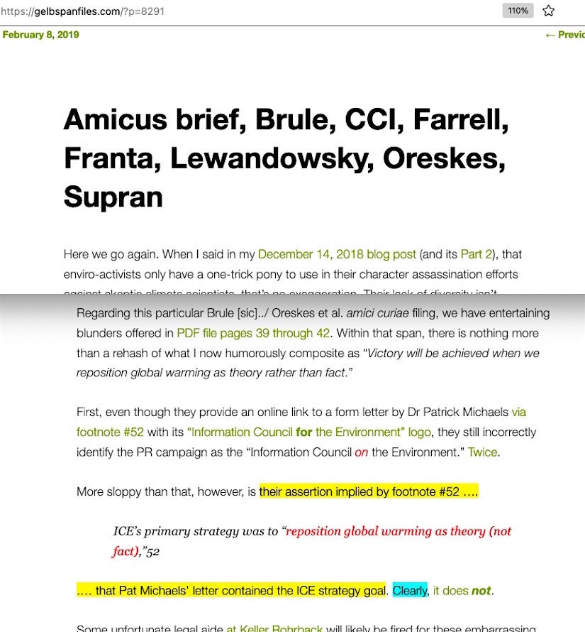 Nevertheless, since Ellison’s filing was offered as evidence to the Supreme Court Justices in hopes that they would not read it, I’ll use what I’d written in my initial blog post draft to reemphasize why these lawsuits are all ripe for outright dismissal; the evidence in them that fossil fuel execs ‘knew’ as far back as the ’60s/’70s their products caused global warming – exclusively – but buried this certain knowledge under deceptive PR campaigns they ran employing ‘shill’ skeptic scientists . . . . is totally without merit.