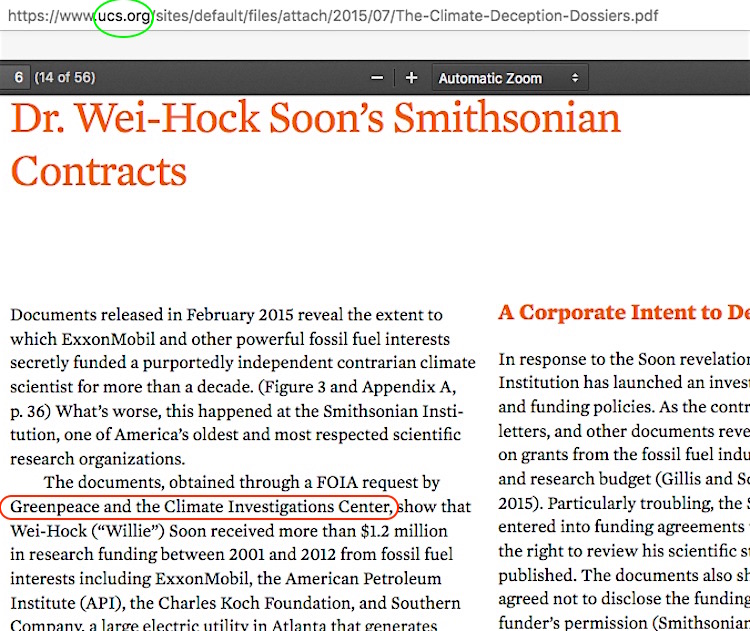 ✓ Appendix PDF page 333 — the Willie Soon accusation, which Dr Soon himself can show is provably false. It’s not out of the realm of possibility that lawyers on his side could show how the accusation has actually crossed into pure defamation territory. The Appendix’s source here – and MN AG Ellison’s – is a Union of Concerned Scientists’ “Dossier” on Dr Soon, but within that Dossier, UCS cites its sources as “Greenpeace and the Climate Investigations Center” – the latter headed at the time of the Dossier publication by Kert Davies. There’s that name again. Two ex-Greenpeacers, John Passacantando and Kert Davies, were revealed in recent email documents obtained via Freedom of Information Law (FOIL) out of the New York state AG’s office to have been the originators of that false accusation against Dr Soon. Hold the thought about those two names until the second bullet point in the next section.