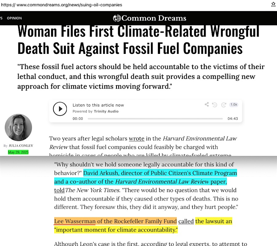 See the too-close-to-be-coincidental things happening here? Remember what I said two paragraphs above about the circled name in the Exxon vendetta email screencapture? Rockefeller Family Fund Director Lee Wassermann. Who was brought up out-of-the-blue praising this Leon v Exxon filing in Common Dreams’ (a supposedly ‘independent news outlet’) report about the lawsuit? You guessed it, Lee Wasserman via his Tweet/X about it. Why would any reader care what a guy at the Rockefeller Family Fund thinks about lawsuits – oh, right he’s part of the plan to get these things rolling, isn’t he?