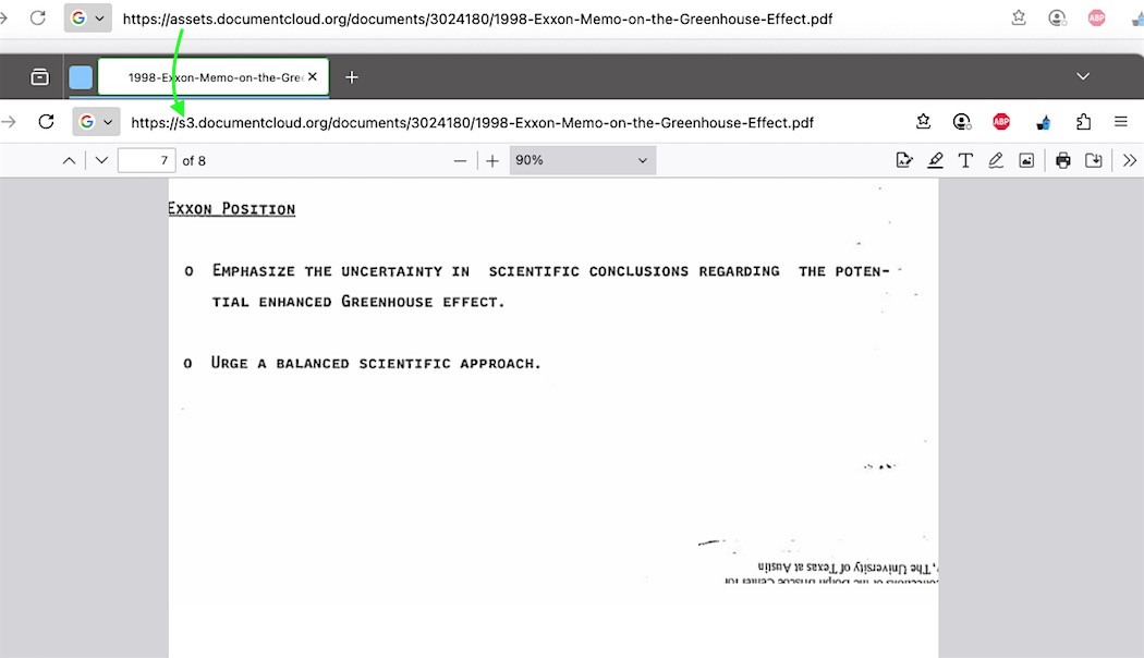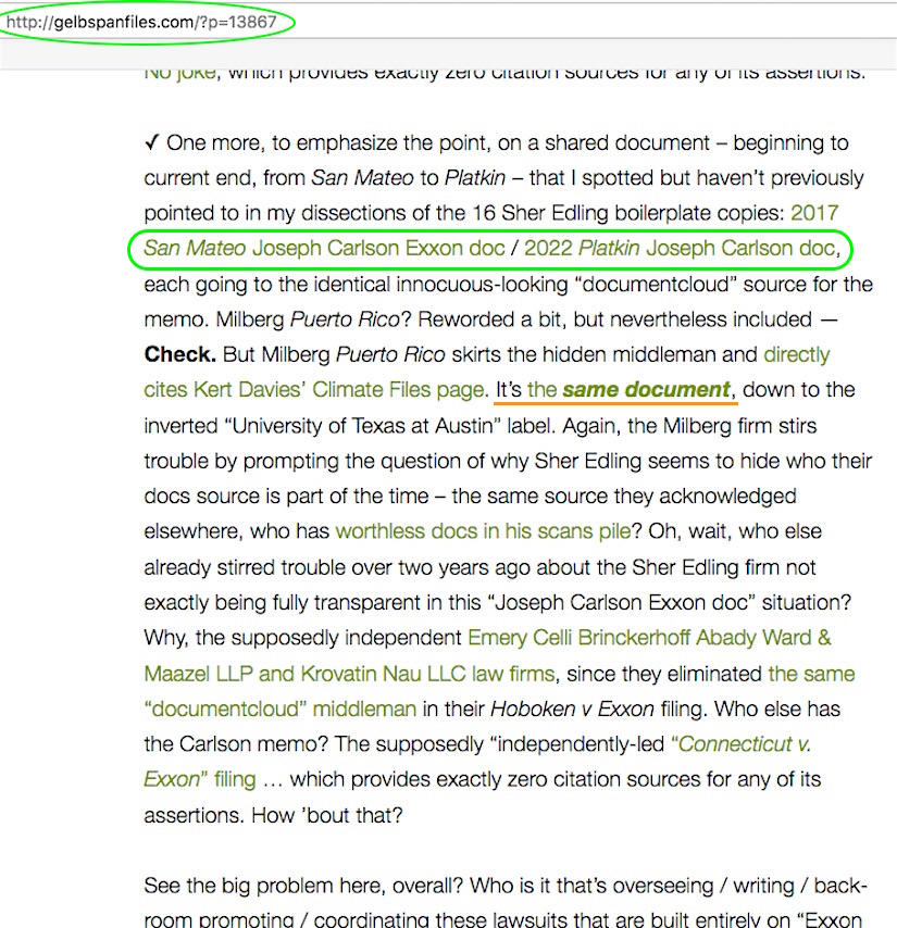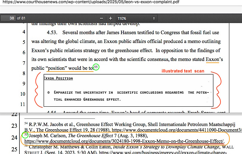 ✓ The “Joseph Carlson memo,” PDF file page 38, paragraph 4.53. Compare that to Sher Edling’s Dec 2023 Makah v Exxon. Only five words are shared between these two, but one item that’s eerily similar is how both don’t simply quote the Carlson memo words in a way that makes them word-searchable in a PDF file; they both show them as scanned illustrations. The item that is very nearly identical is the citation link source for the memo — in Makah, the “https://assets.” part at the beginning of the “DocumentCloud” link and the “.pdf” at the end automatically defaulted to a page having no indication of who its source is. It’s as though the Sher Edling law firm was trying to hide who the source was. Leon v Exxon clearly shows the source as Kert Davies at the Climate Investigations Center. It’s the identical 9-page document scan.