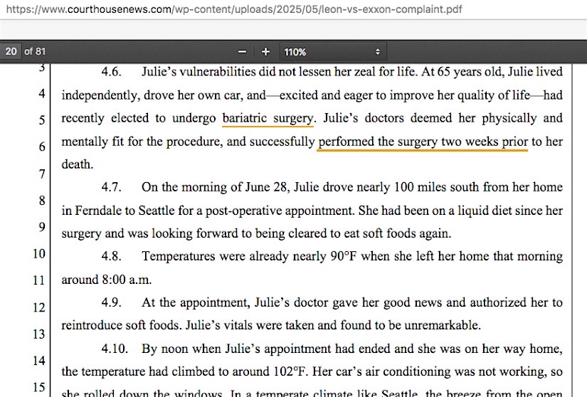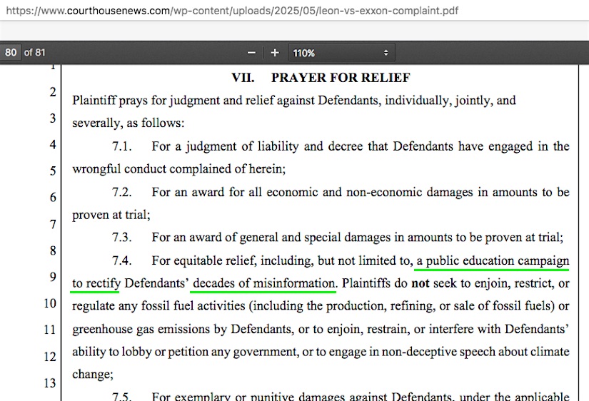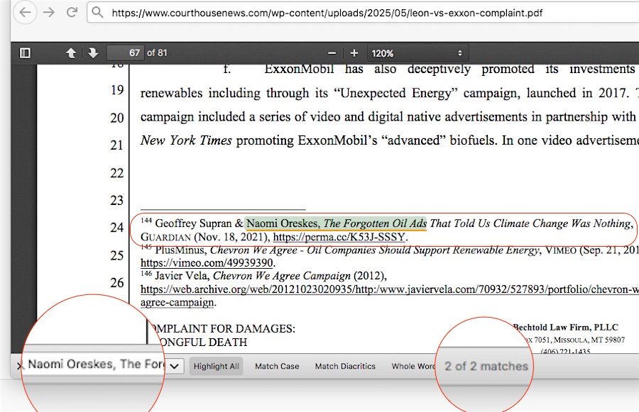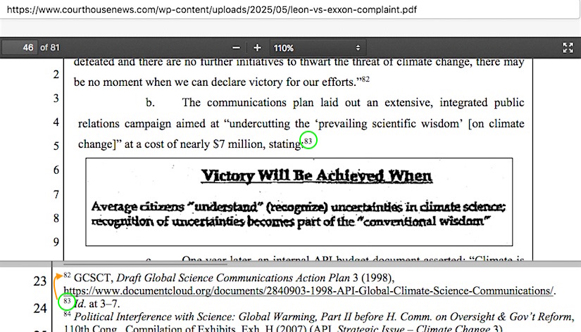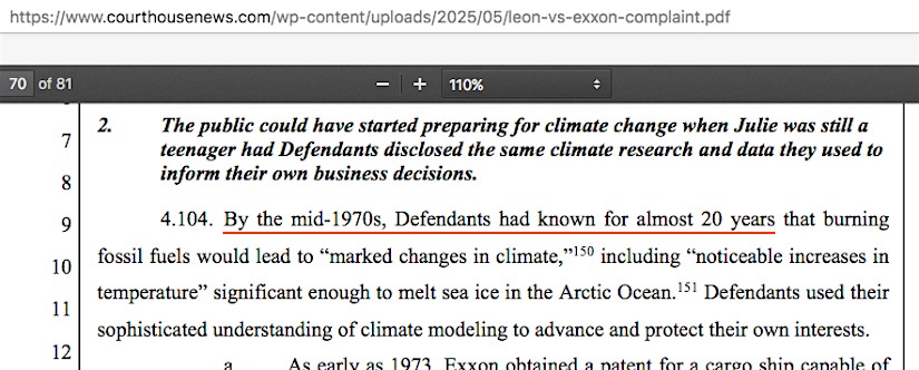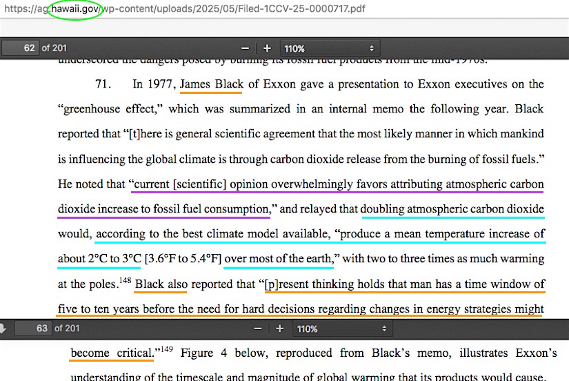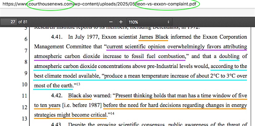 ✓ The 1977 “James Black Exxon Report,” PDF File page 27, paragraphs 4.41 and 4.42. Compare what’s seen in my screencapture there to Sher Edling’s latest filing, the 5/1/25 Hawaii v BP lawsuit, and to Sher Edling’s 2017 San Mateo v Chevron. Understandable that Sher Edling would use their own material repeatedly . . . . but what explains essentially the same repetition in other filings supposedly having no association whatsoever with Sher Edling? Hoboken v Exxon. Connecticut v Exxon. California v Exxon. Minnesota v American Petroleum Institute. On top of all that, is attorney Matt “the legal brains behind the campaign against the industry” Pawa’s King County v BP filing — filed in the same court as this Leon v Exxon case. Imagine if a judge in the King County Superior Court said, “what a minute, where have I seen this before??”