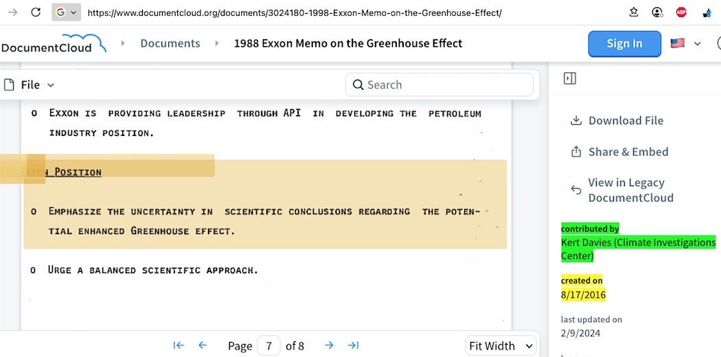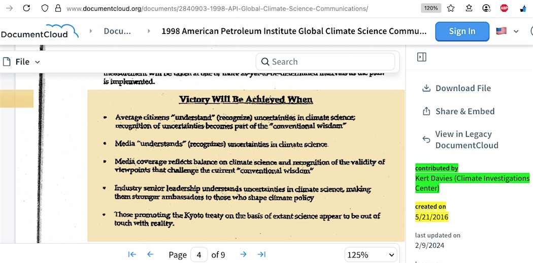 ✓ The “victory will be achieved” memos, PDF file page 46, paragraph 4.66.b. It’s obviously a scan image. Who else did that? Sher Edling’s Makah filing. And the supposedly unrelated law firm representing County of Multnomah. There’s far more – the collective prior situation surrounding the “victory”memo set is besieged with faults, as I showed in a series of blog posts in my specific category for it. First and foremost, it was never implemented (never-implemented!) anywhere, thus it is worthless to prove industry disinformation campaigns happened. And just like the other situations above, there’s the Kert Davies problem surrounding it. Give Leon v Exxon credit for its citation source linking straight to Davies’ [technically former] Climate Investigations Center, but in doing so, the law firm here exposes a rather large problem for the Sher Edling law firm’s multiple citation sources throughout their filings over the years. As I showed way back in my dissection of Honolulu v Sunoco, Sher Edling’s citation source essentially hid Kert Davies association with just slight changes to the online document file address. His association of working at Greenpeace when he uploaded that file.