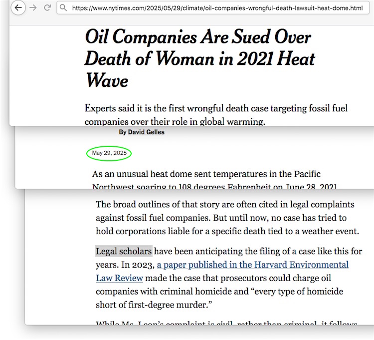 Borrowing a line from the day-later UK Guardian news flash about this May 28, 2025-filed lawsuit – and by default, all the prior “ExxonKnew” lawsuits I’ve dissected – “Previous suits accused companies of breaching product liability and consumer protection laws and engaging in fraud and racketeering. But [Leon v Exxon Mobil Corp] is the first attempt to hold oil companies responsible for an individual climate-related death.” Yes, first-ever lawsuit using that lawfare tactic, but not the first time I’ve seen it pushed. I first wrote about this ridiculous personal injury angle, from David Arkush of the “Public Citizen” group, back in March 2023. He’d submitted his ‘scholarly paper’ draft version to the Harvard Law Environmental Review (HELR) on the notion of ‘climate homicide,’ which inadvertently showed his nearly complete enslavement to the same meritless ‘evidence’ which most the “ExxonKnew” lawsuits claim is proof that the fossil fuel industry ran disinformation campaigns employing skeptic climate scientist ‘shills.’ When his paper was finally published in May 2024, I firmly suggested to HELR that his paper needed to be retracted. HELR did not do so, which thus only gave Arkush and Public Citizen the green light to proceed full steam ahead on the idiotic idea. Upon seeing Arkush and Public Citizen putting out a proposal to Arizona prosecutors just two months later on how to charge for ‘climate homicide,’ my blog post title for my dissection of his proposal posed the question of whether he was doing nothing more than trying to – ineptly – muscle his way into the lawfare territory already staked out in 2017 by the San Francisco Sher Edling law firm. I say “ineptly” because he ultimately used all of the four core accusation elements seen in their multiple filings.