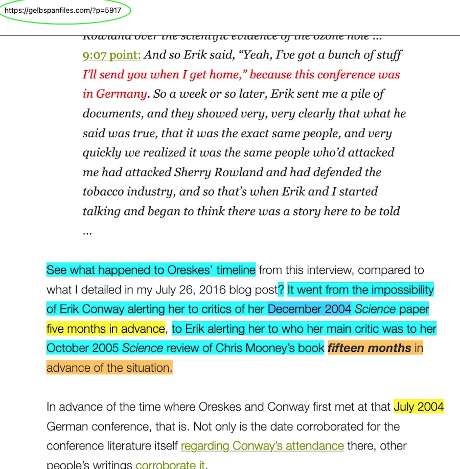 • And in her claims that she learned at an obscure science conference who the ‘merchants of doubt’ in this climate issue, she omits how the use of a time-travel machine was needed for that event to have taken place the way she describes it.