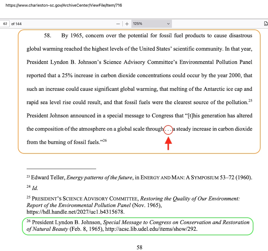Complaint affirmatively alleges that the dangers posed to the climate by fossil fuel use have been well-documented and publicized since at least the 1960s. … in 1965, “President Lyndon B. Johnson’s Science Advisory Committee’s Environmental Pollution Panel reported that a 25% increase in carbon dioxide concentrations could occur by the year 2000” and listed numerous expected side effects that would be caused by “global warming.”