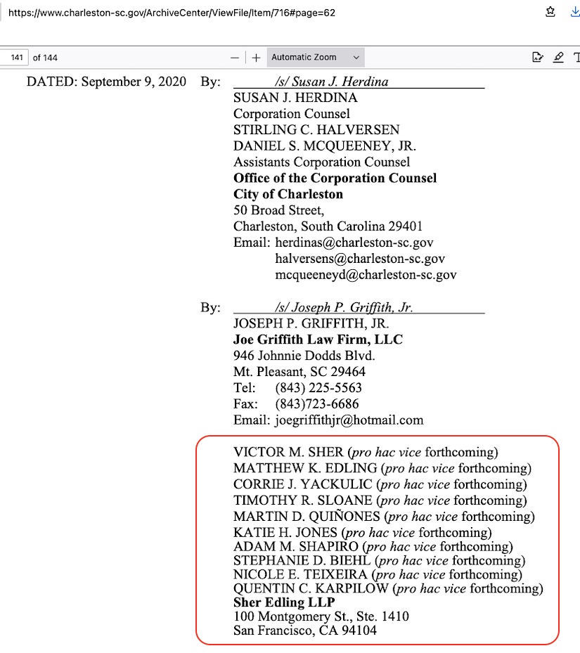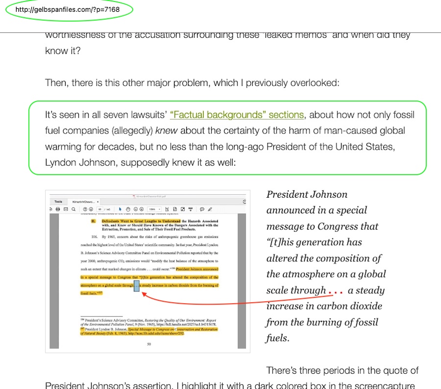 Like I said in my dissection of Rhode Island v. Chevron, those three little dots, an elipsis, implies a large amount of unnecessary text is omitted. What text was missing in President Johnson’s speech text words there? Only three words; “radioactive materials and.” Include those three words in his speech text, and they totally undermine the entire notion that the exclusive driver of global warming was carbon dioxide. There’s not a single enviro-activist out there calling for an end of greenhouse-inducing radioactive material emissions into the atmosphere. Who was it who first saw the need to omit those words from the speech? Naomi Oreskes. Who’s the law firm handling Charleston? Sher Edling. Who’s on retainer with Sher Edling? Naomi Oreskes.