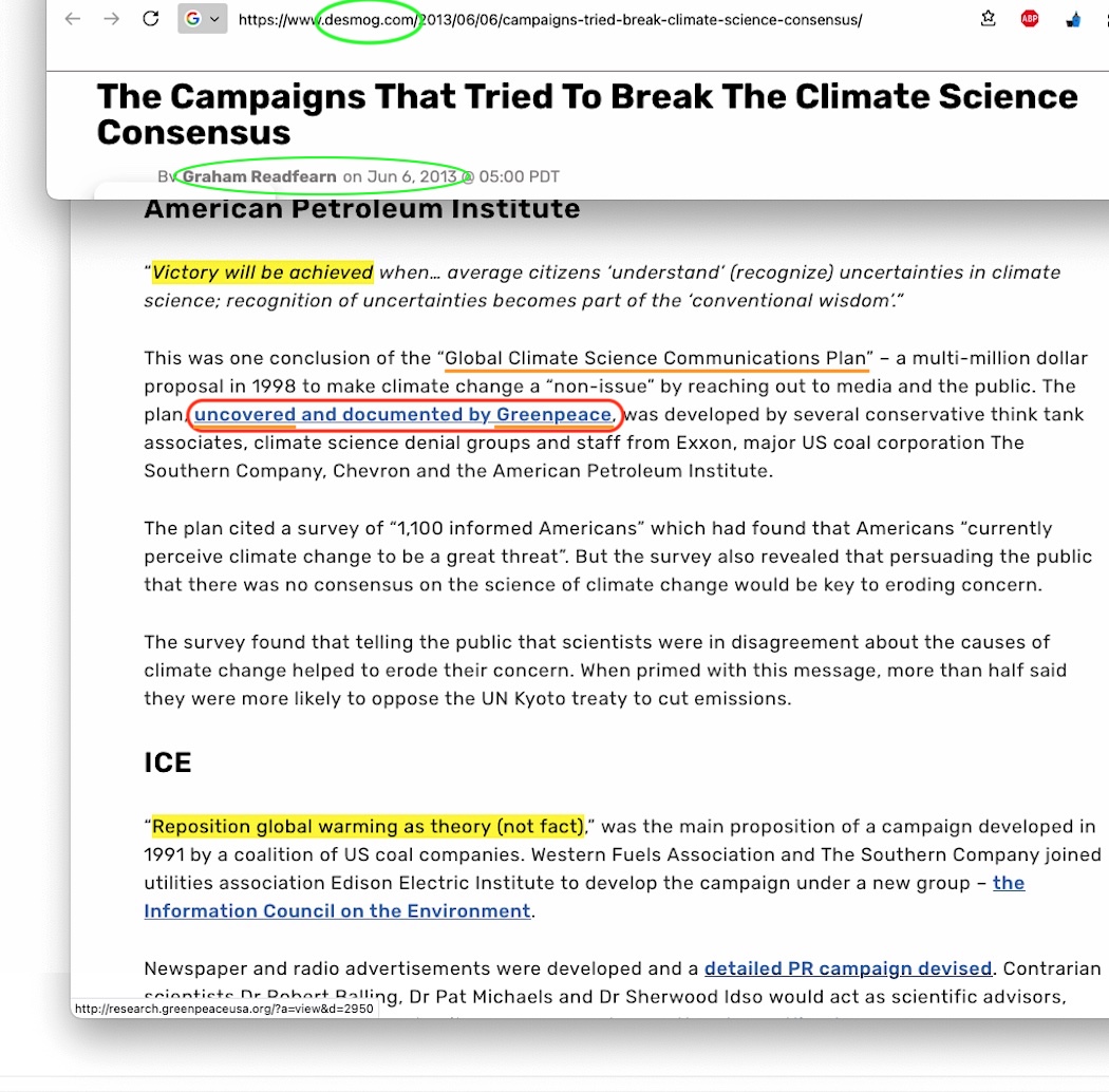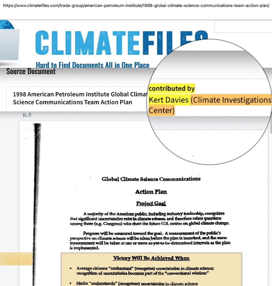 What group claims to have ‘obtained’ the “reposition global warming” memos alongside with Gelbspan? Ozone Action, the place where Kert Davies worked before he moved on to Greenpeace. And where does Desmogblog source their copy of the “victory will be achieved” memos? Greenpeace. Right above their entry for the “reposition global warming” memos entry which they source from the old “Greenpeace USA née Ozone Action” scans collection.
