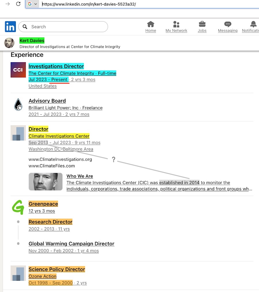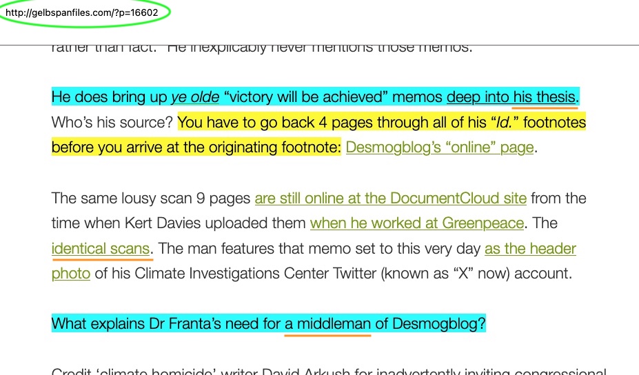 The Climate Investigations Center with its integral Climate Files platform is – or was – Kert Davies’ post-Greenpeace workplace and before he moved into his present position at the Center for Climate Integrity. Franta accomplishes nothing more in this maneuver than throw another ‘middleman source link’ onto the pile when a link citation straight to Davies’ CIC / Climate Files page for the worthless memos would suffice. Or even a citation link to Davies’ Greenpeace-era upload when it still works fine. Or the Inside Climate News version. They are all the very same set of lousy photocopy scans. Franta could have even provided a source link to Desmogblog … oh, wait, he did, except that particular instance was nearly three years earlier.