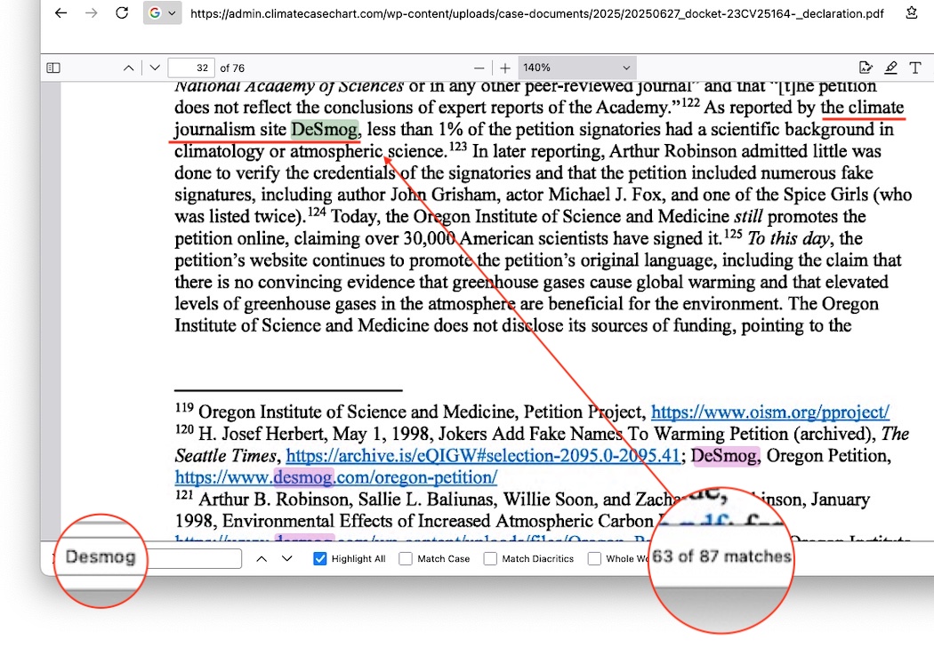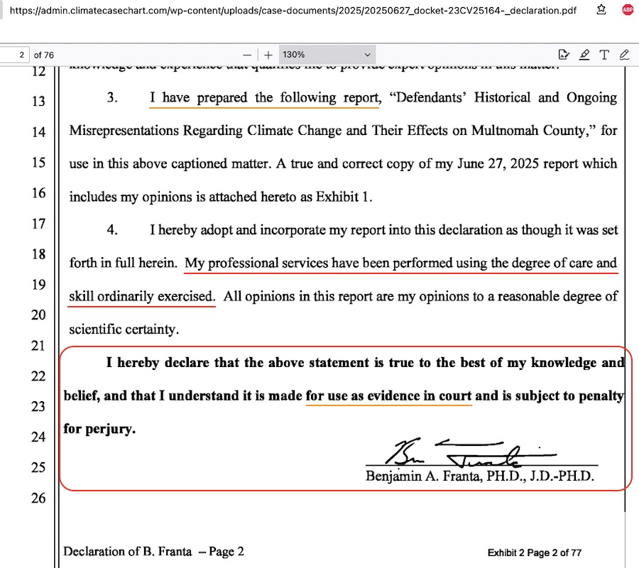 Not helping himself at all on credibility, who does Franta cite 87 times in his Declaration for Multnomah, including where he says the source is a “climate journalism site”? DeSmog.