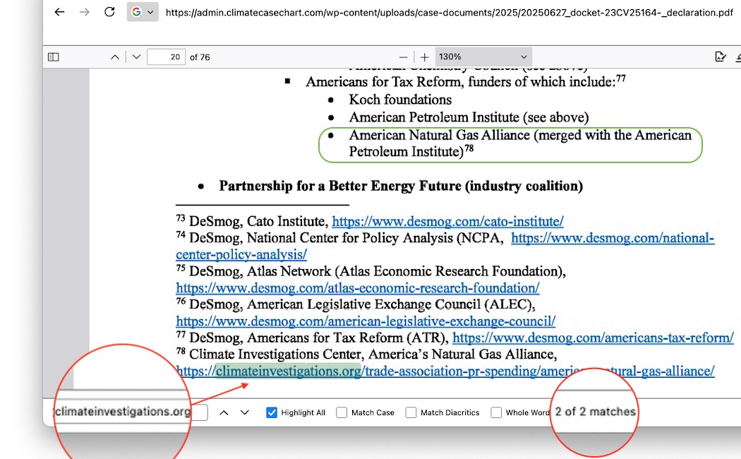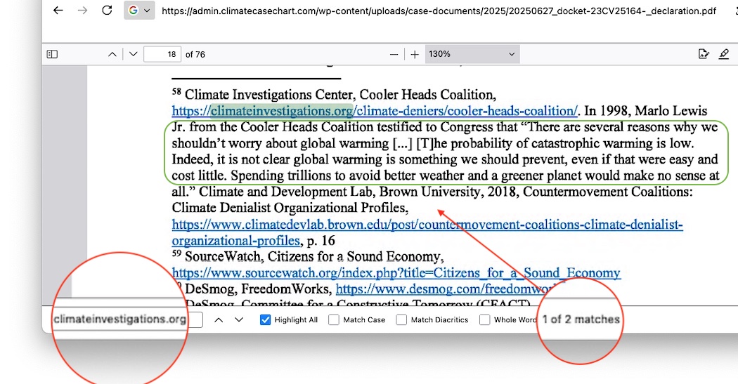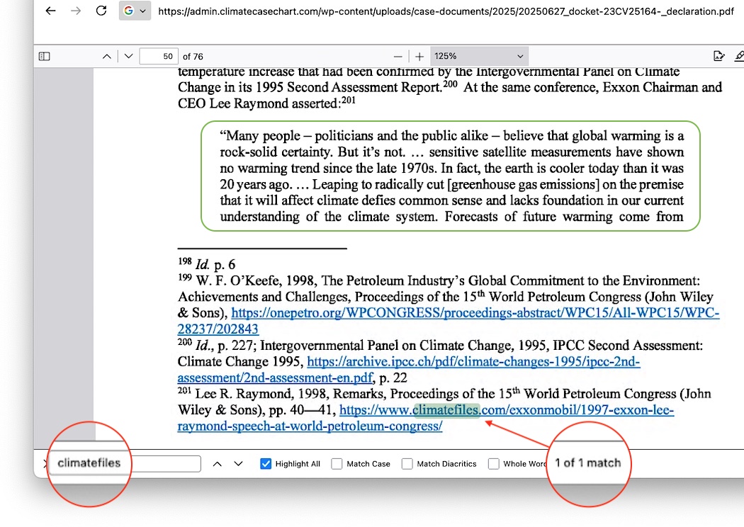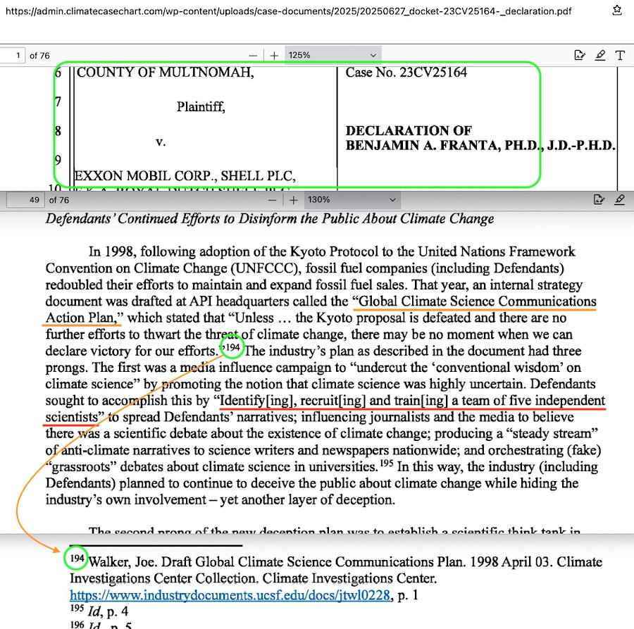Odd that in all of Ben Franta’s 76 page-long Declaration, he only cites Kert Davies’ Climate Files as a source one time, and only for a document in which an Exxon official makes a statement of pure common sense. He cited Climate Investigations Center just twice, once for a basic guilt-by-association item, and another time for … a person’s statement of basic common sense.