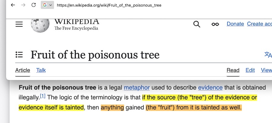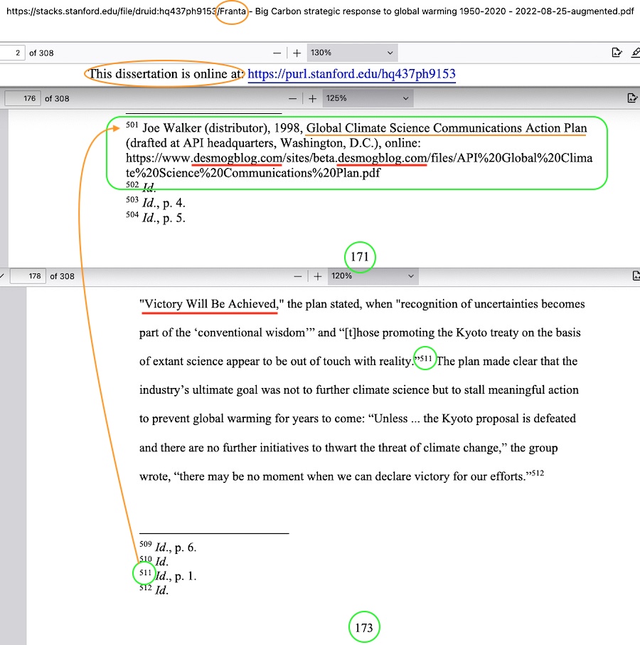The three month-old reinforcement of his problem I’m speaking of is his “Declaration of Benjamin A. Franta” filed on behalf of the plaintiffs in the Oregon state County of Multnomah v Exxon lawsuit. If I may stretch the traditional “fruit of the poisonous tree” term (surrounding illegally obtained evidence), I suggest that if a person’s main accusation – the tree – is bogus, then all else from this person is poisonous fruit. So, set aside all the ancillary other ‘evidence’ in Franta’s 76-page behemoth declaration here, and focus on his central bit about ye olde 1998 American Petroleum Institute “victory will be achieved” memos.