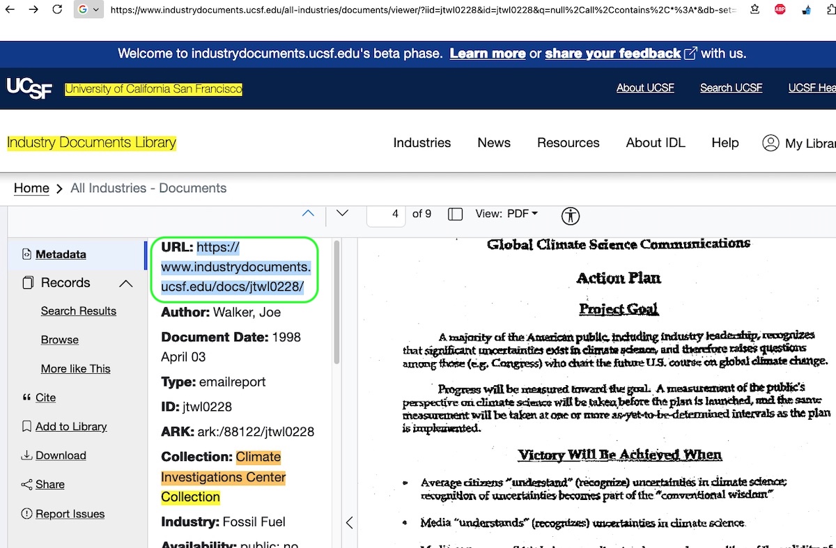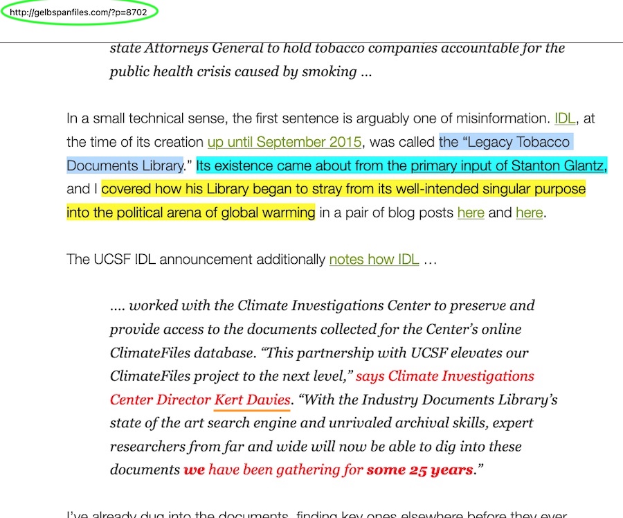 Yeah, that’s one-and-the-same memo set that Greenpeace worker Kert Davies uploaded back in 2013 – which Sher Edling seemingly tried to bury – but notice here how Franta’s source first mentions “Climate Investigations Center Collection”, and then provides a link to the University of California San Francisco (UCSF) “Industry Documents Library” page with that same label . . . . as though that’s the UCSF’s own ‘climate investigations arm.’