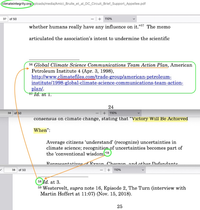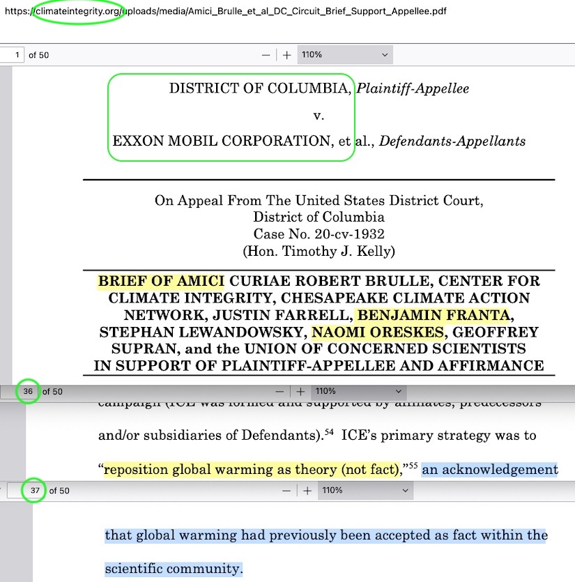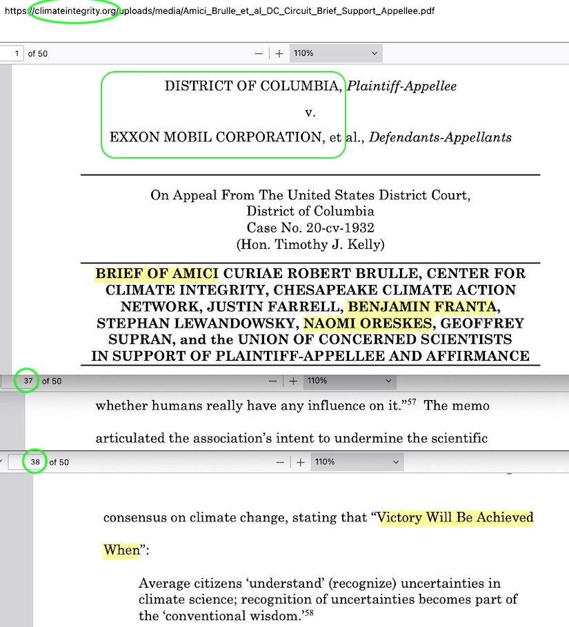 That Naomi Oreskes, who first gained her fame in accusing the fossil fuel industry of running disinformation campaigns where her source for that was ye olde “reposition global warming” memos — the other set of worthless memos that were never implemented anywhere. The very same Naomi Oreskes who shares the billing in her assortment of Friends of the Court filings with Ben Franta, in which their arguments about industry disinfo campaigns are enslaved to . . . . . . . wait for it . . . . . . . . . . both the “reposition global warming” memos and the “victory will be achieved” memos. Who was Oreskes’ / Franta’s source for the “victory will be achieved” memos in their amici brief? Kert Davies’ Climate Files. One more thing about those last two screencaptures – who’s the url address link for at the top? The Center for Climate Integrity. Kert Davies’ current workplace.