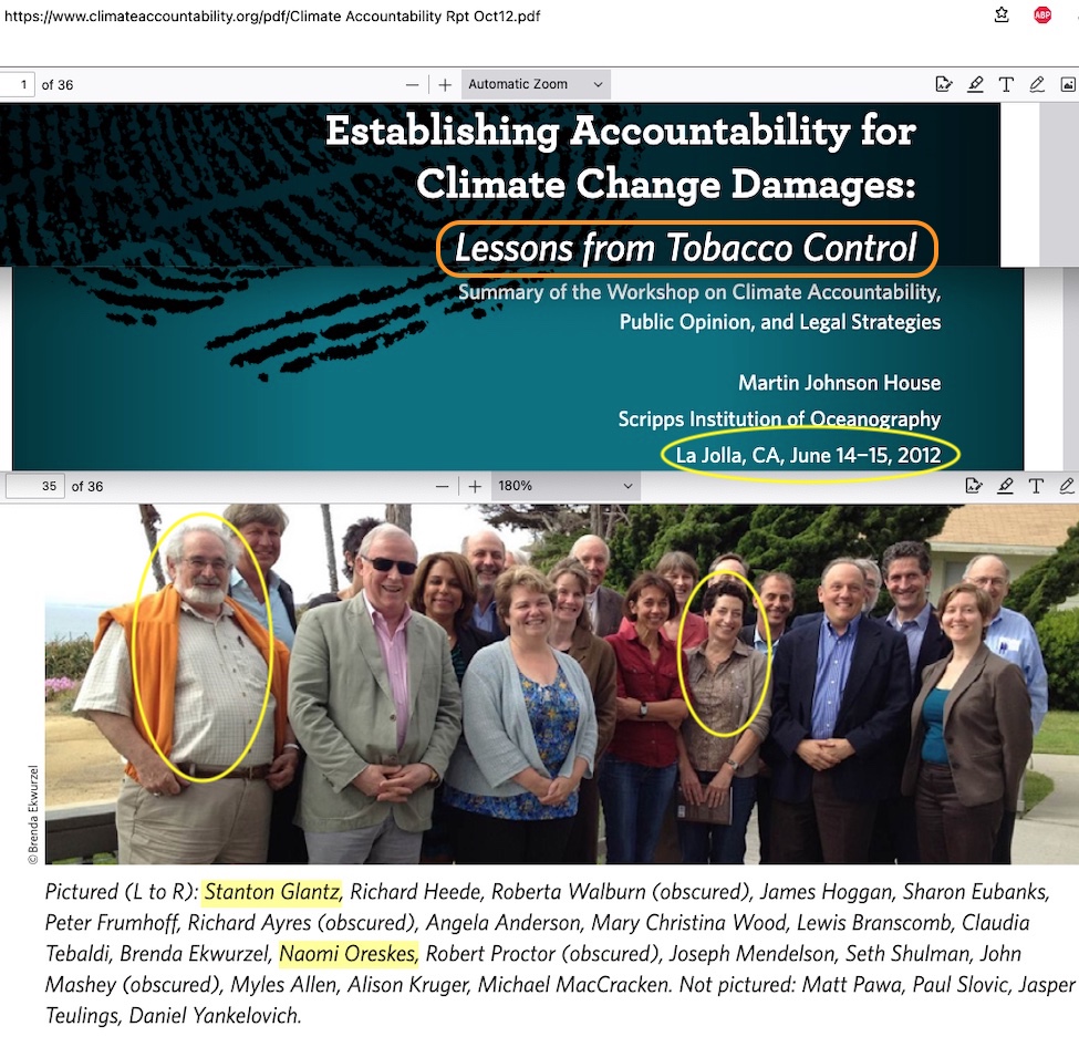 That Stanton Glantz, a participant in the’ notorious 2012 La Jolla California workshop Naomi Oreskes conceived as a planning session on how to frame the fossil fuel industry as acting hardly different than the old tobacco industry The very same Stanton Glantz, who had document scans about ye olde “reposition global warming memos” inexplicably within his his Tobacco Docs Library which had literally nothing to do with the tobacco industry – a fatal problem I covered in a pair of blog posts way back in 2014 / 2015 here and here.
